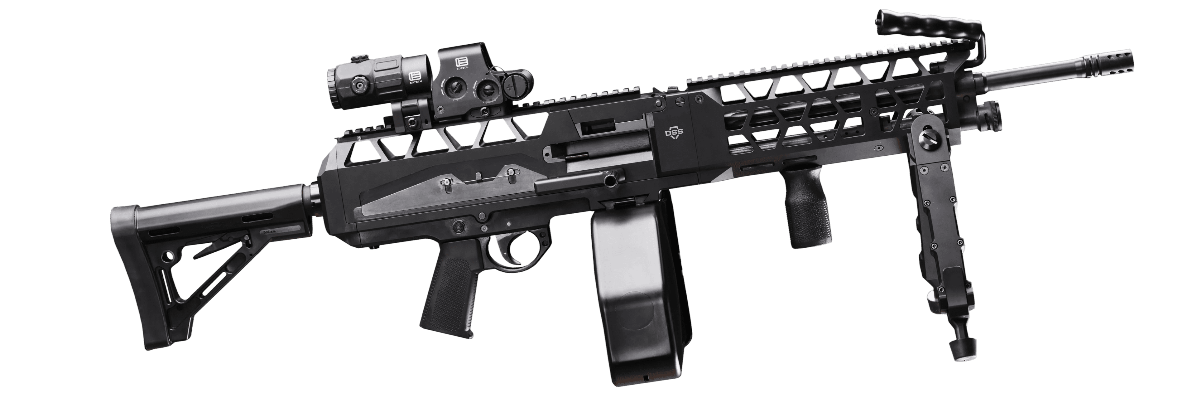 The PZD MK24 represents the premier model in a newly developed category of PZD machine guns by DSS. This weapon system was designed to address the requirements of the 21st-century operator. The combination of the essential characteristics of a machine gun with the ergonomics and weight of an assault rifle represents a significant innovation in the field of weaponry.